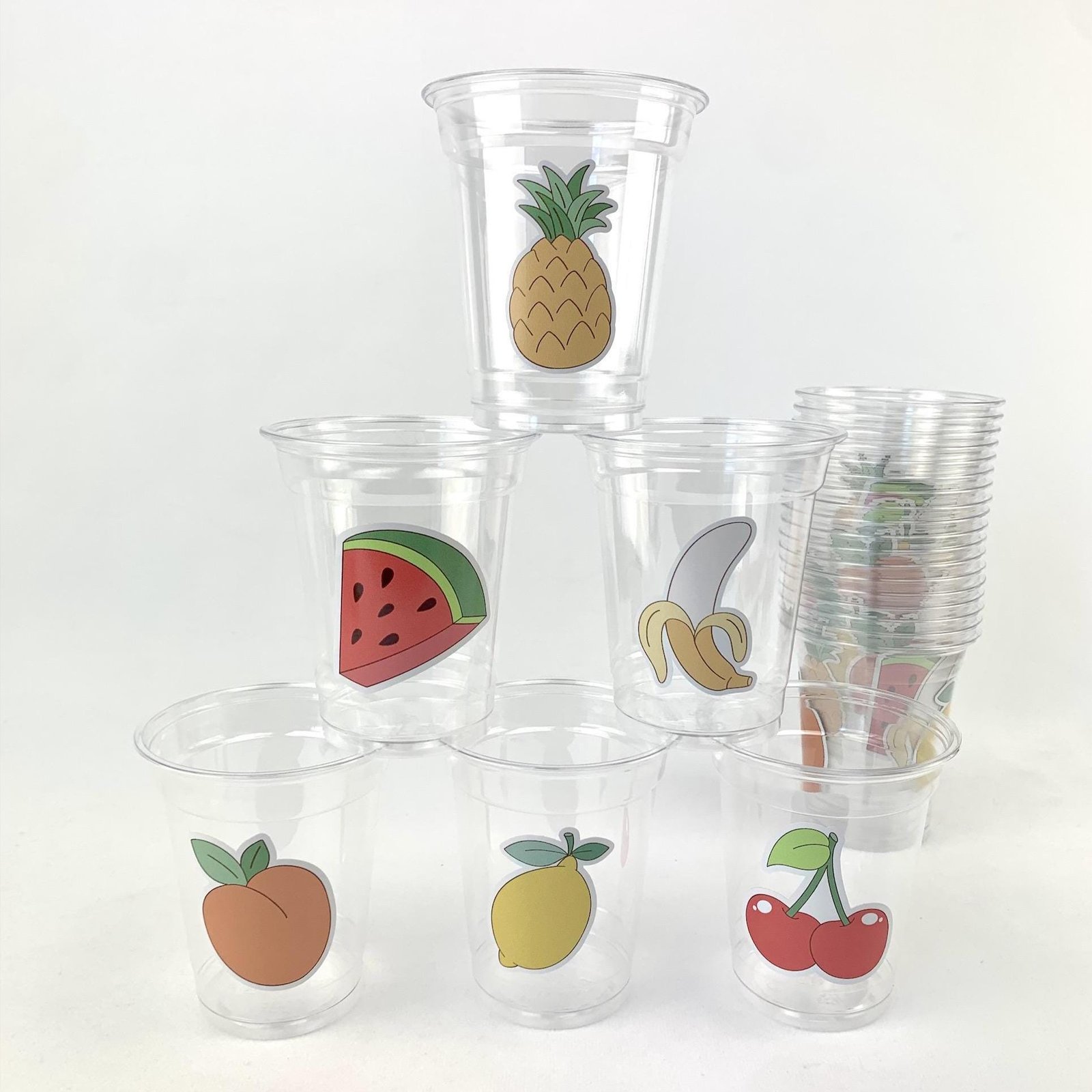 Serve up something sweet with these clear 12oz plastic cups featuring assorted fruit decals �pineapple, watermelon, peach, lemon, banana, and cherry! A fun and colorful touch for summer birthdays, fruit-themed baby showers, backyard picnics, or any juicy celebration. Lightweight and disposable for easy cleanup, with the option to add lids.