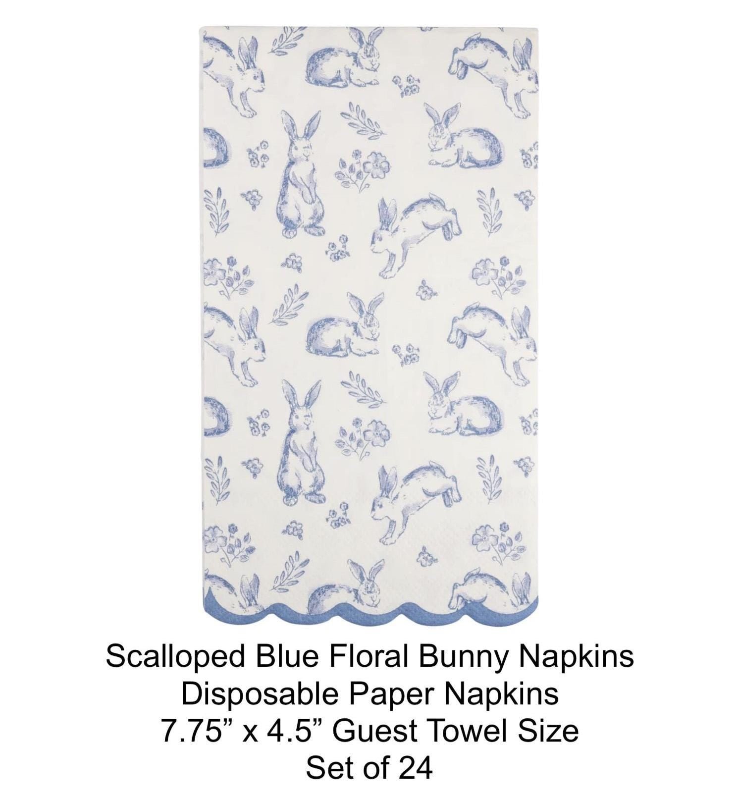 Celebrate spring in style with these charming Blue Bunny Napkins! Featuring an elegant toile-inspired design, these creamy white guest towel napkins showcase blue bunnies in various playful poses—sitting, hopping, and standing—surrounded by delicate floral patterns and a scalloped blue edge. Perfect for Easter brunches, spring gatherings, and bunny baby showers or birthdays, these paper napkins add a touch of sophistication to your tablescape.