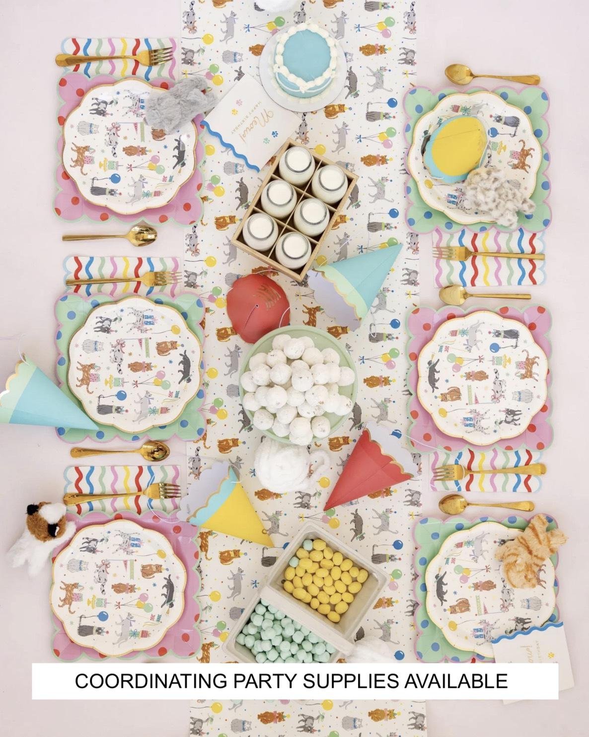Make your celebration purr-fect with these Cat Birthday Napkins! These creamy white paper napkins feature a scalloped edge and a playful design of orange, black, gray, and spotted cats wearing party hats and bows, surrounded by balloons and confetti, along with delicate gold foil accents. These festive party napkins are ideal for cat lovers’ birthdays or pet-themed parties. Add a whisker of fun to your table with these adorable napkins!