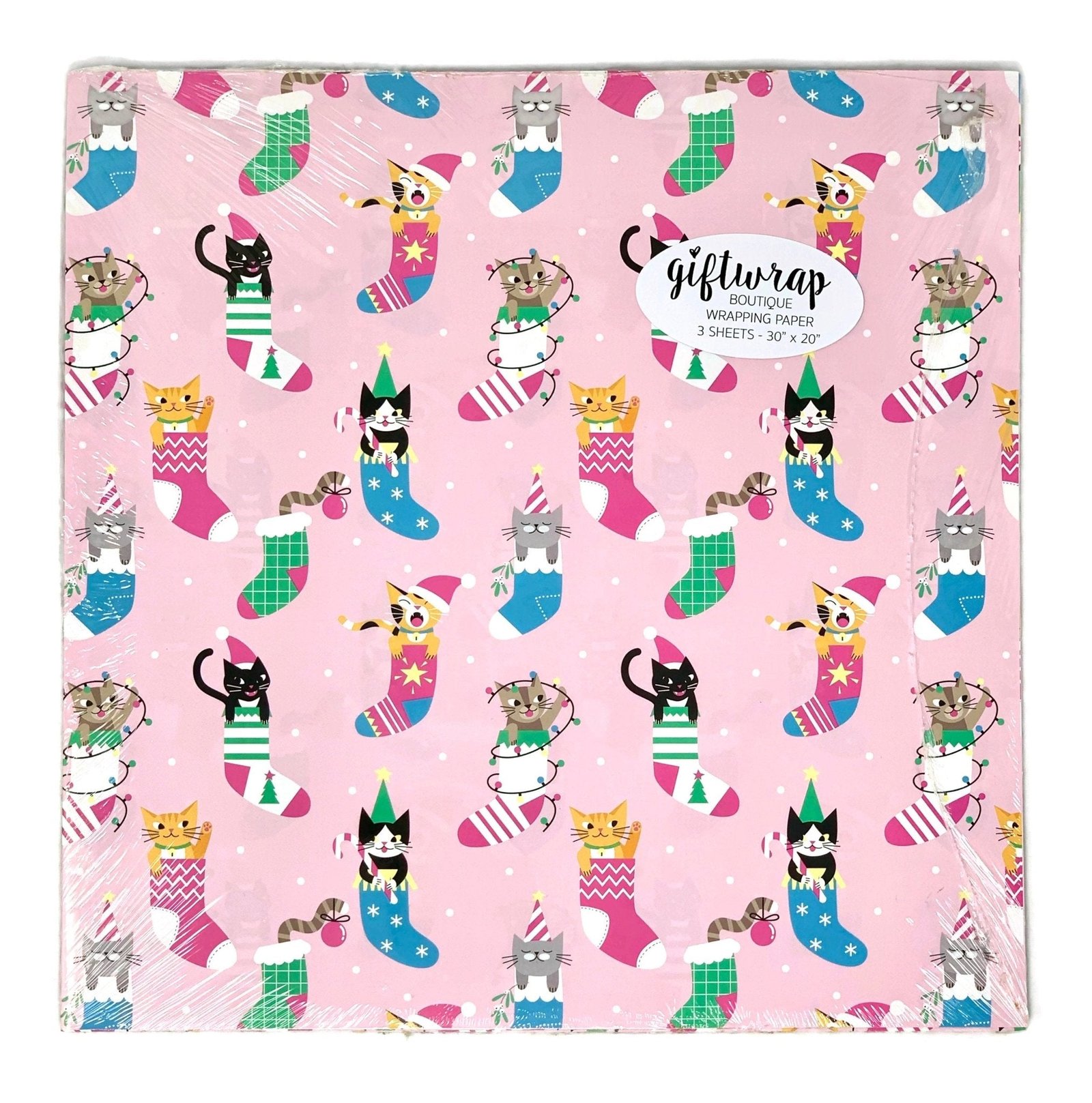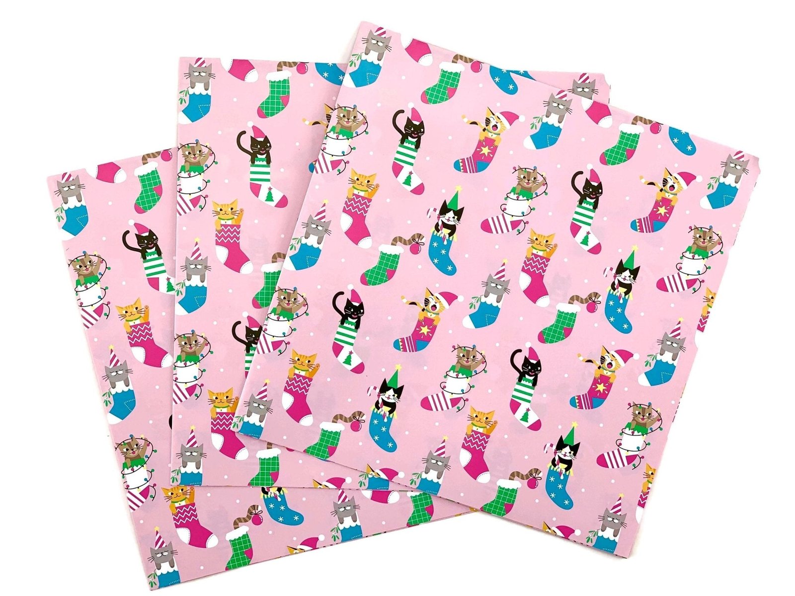 This adorable Christmas cats wrapping paper will make your gift giving extra special this holiday season! Printed in vibrant colors on premium heavyweight paper, this high quality paper feels smooth, thick and velvety to the touch. Adorable kitties in stockings on a pink background make this a cheery print that will look adorable underneath your Christmas tree!