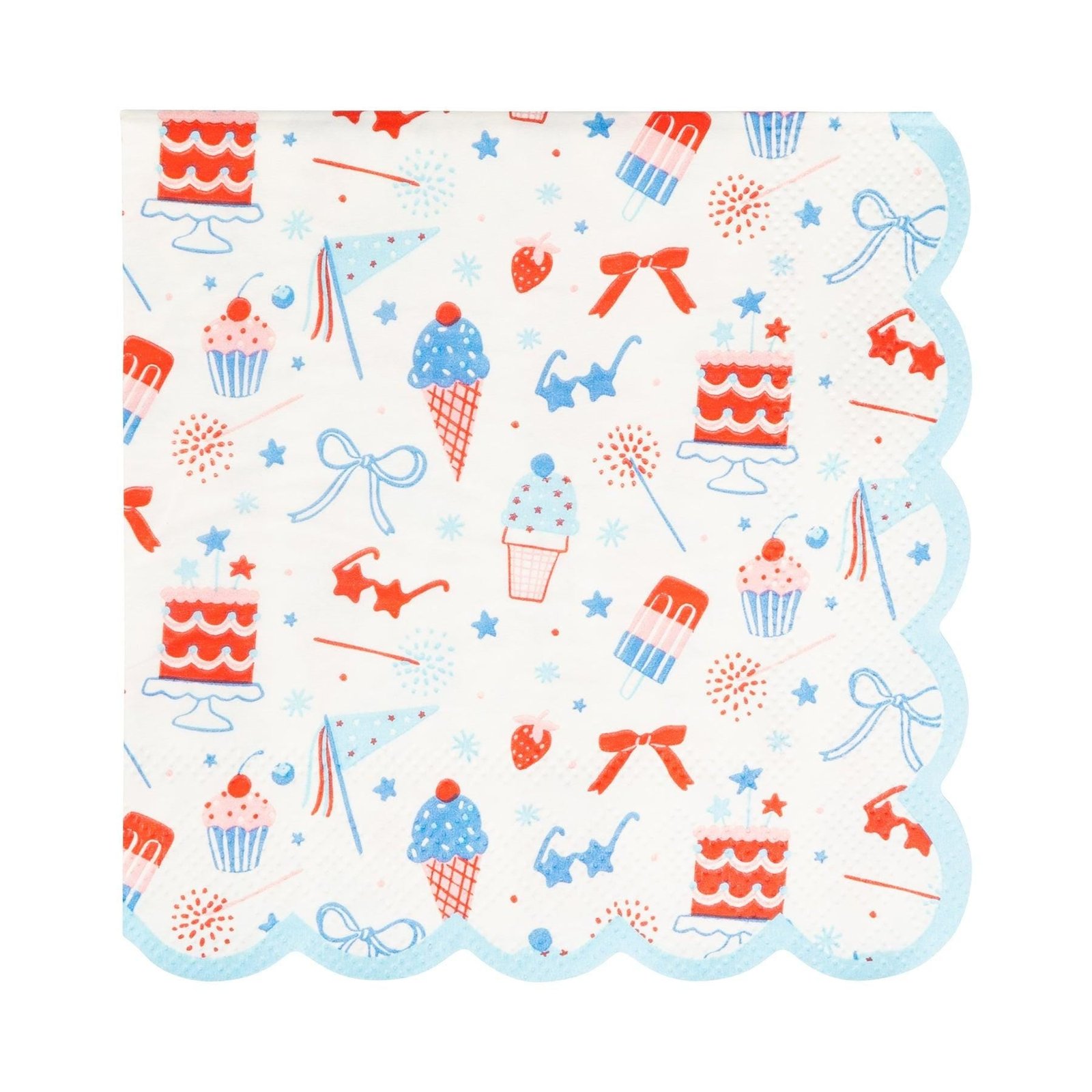 Add a festive splash to your summer celebrations with these red, white, and blue beverage napkins! With fun illustrations of cake, sunglasses, ice cream, bows, stars, popsicles, fruit and fireworks, they’re perfect for everything from pool parties to 4th of July barbecues, Americana baby showers, and patriotic birthdays. Cute, colorful, and party-ready!