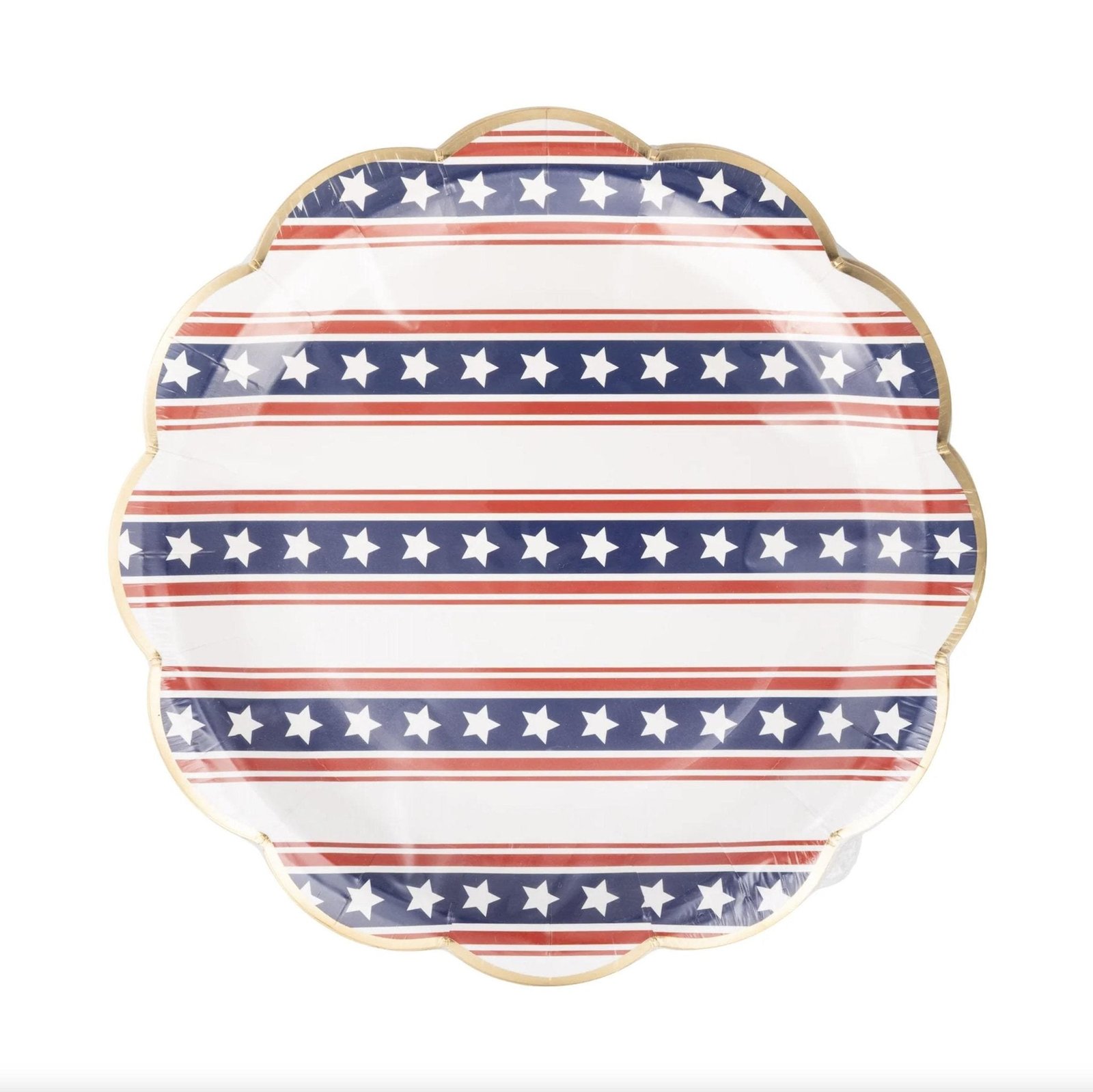 Bring star-spangled style to your table with these festive 9″ dinner plates! Designed with classic stars and stripes in red, white, and blue and edged in gold foil, they’re perfect for 4th of July parties, patriotic birthdays, summer BBQs, or Americana-themed baby showers.